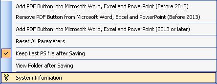 Inside Microsoft Office, Select Tools => Customize=> Toolbars=>Reset to remove the PDF Icon.Add PDF Button into Microsoft Word, Excel and PowerPoint (2013 or later) The PDFill PDF Button for Office 2013 or later needs to be downloaded and installed separately. See PDFill PDF Button for Office 2013. Reset All Parameters Reset all parameters to the default values and exit the dialog. Keep Last PS file after Saving After you print into the writer, the PS will be kept so that you can save into a new file using new options without printing the same document again. View Folder after saving The folder will be displayed automatically after the saving. System Information About PDFill PDF & Image Writer and System Information