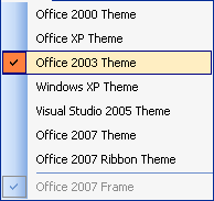 There are 8 themes for menu style: Microsoft Office 2000, Office XP, Office 2003, Windows XP, Visual Studio 2005, Office 2007, Office 2007 Ribbon, or Office 2007 Frame