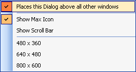 Places this Dialog above all other windows This dialog will be positioned topmost above all the other windows. Show Max Icon Show the max icon of the dialog. Show Scroll Bar Show the scroll bar of the dialog. 480 x 360 The window size of the dialog will be 480 x 360. 640 x 480 The window size of the dialog will be 640 x 480. 800 x 600 The window size of the dialog will be 800 x 600.
